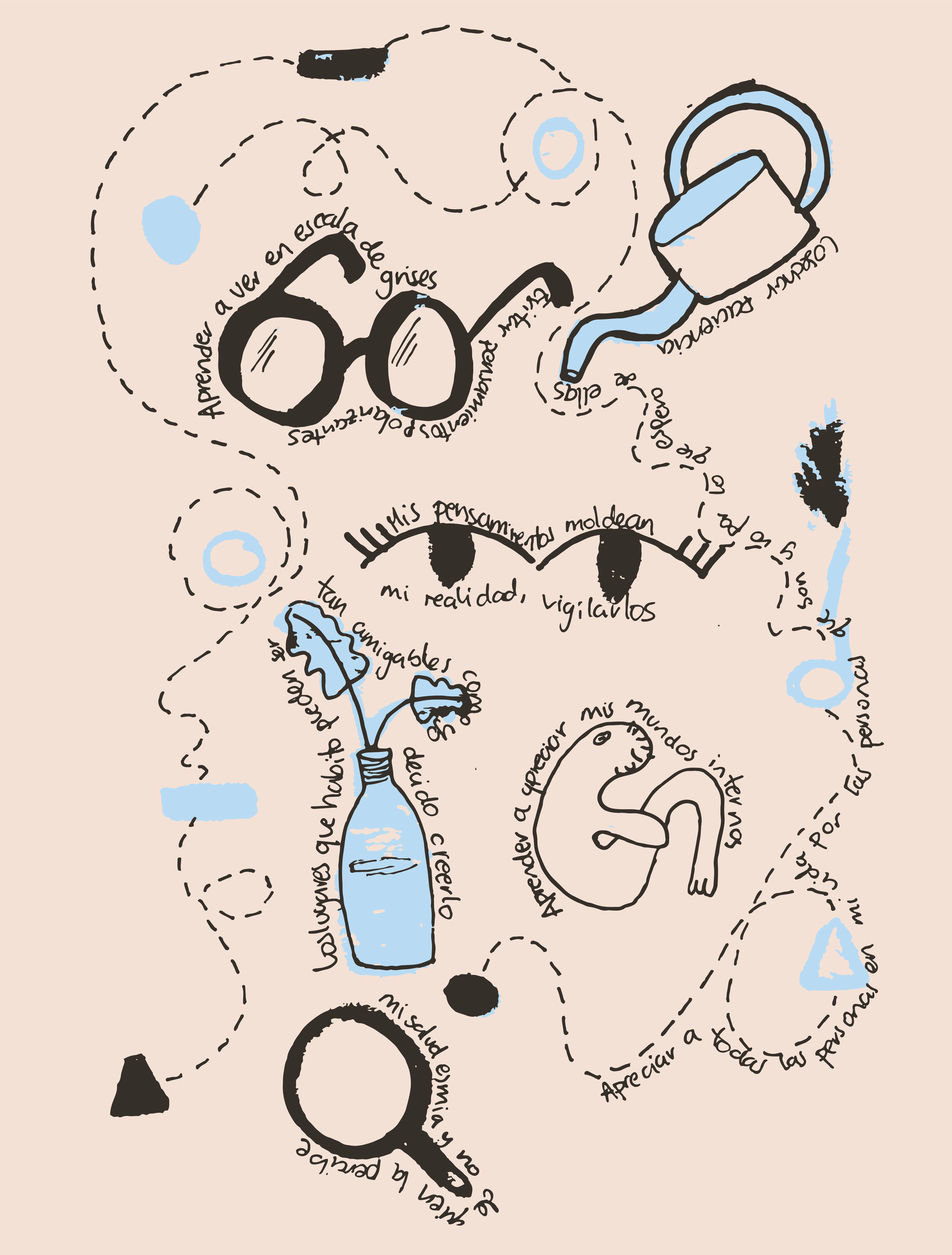 Algunas lecciones me han entrado más fácil en la cabeza que otras y también hay algunas que siguen sin poder entrar del todo, y por eso algo muy sencillo pero que realmente funciona e intento hacer con frecuencia es simplemente repetírmelas una y otra vez. Trato de recordarlas cada vez que veo la pared aproximarse y como parte de este proceso de reafirmación decidí ilustrar unas cuantas que he llevado conmigo recientemente.